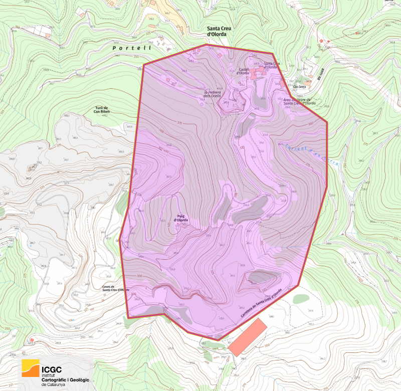 El treball de camp no segueix un itinerari lineal, sinó que es desenvolupa en una superfície que no arriba a mig quilòmetre quadrat als voltants del conjunt medieval de Santa Creu d’Olorda i de la pedrera. La zona de treball queda delimitada per la línia vermella del mapa següent: