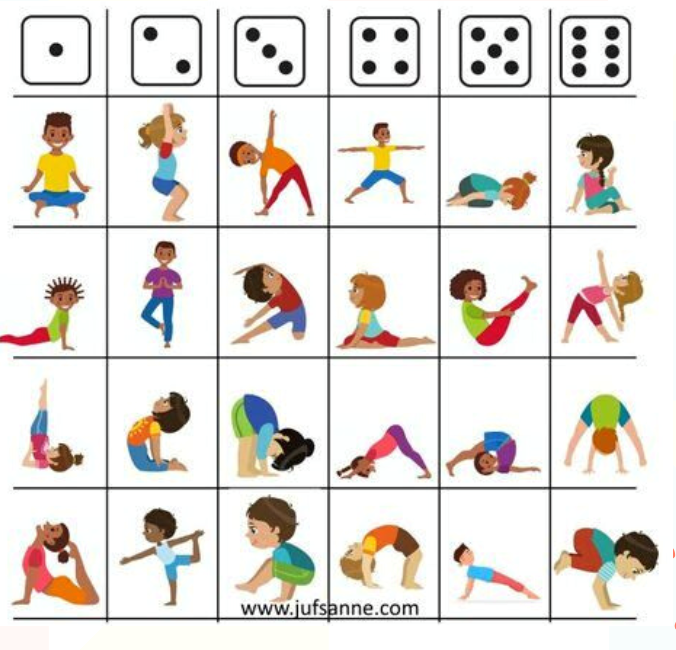 Posa’t una música tranquil.la i reprodueix les postures de ioga que t’adjunto tot tirant el dau. Recorda mantenir les postures i controlar les respiracions.