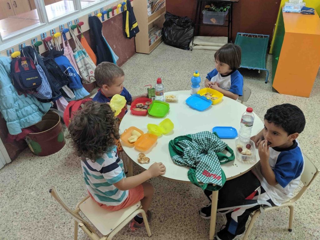 Els nens i nenes de la classe de P3B esmorzem cada dia a les 10. Abans anem a fer pipí i ens rentem les mans.