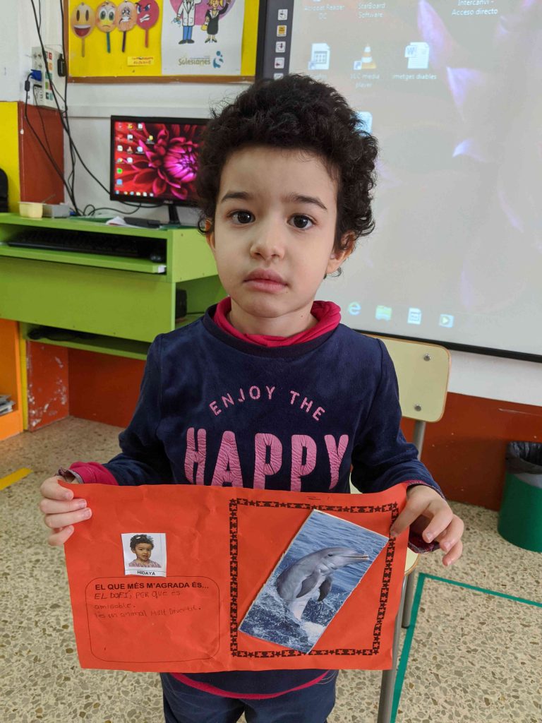 Els dofins són uns animals molt simpàtics i molts nens i nenes també els agraden força. Alguns nens i nenes han vist alguna vegada dofins però altres no. A la Hidaya li costa molt parlar davant de tots i el Carles l’ha ajudat molt però ha portat la foto i així sabem que el que més li agrada són els dofins.