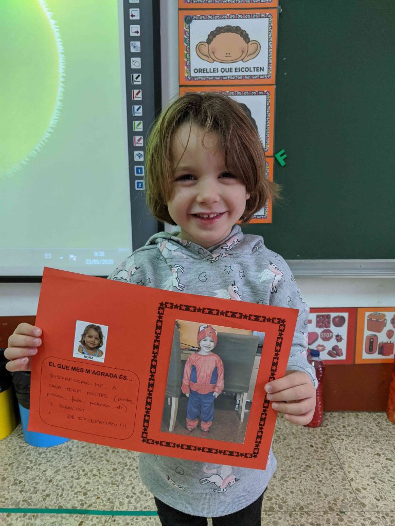 Segur que la Nora està esperant el Carnestoltes per disfressar-se cada dia. La veritat és que ens ho ha explicat molt bé, sense vergonya i fent servir la veu alta i clara. L’he hagut d’ajudar una mica però ha sabut respondre totes les preguntes i ens ha encantat la seva disfressa.