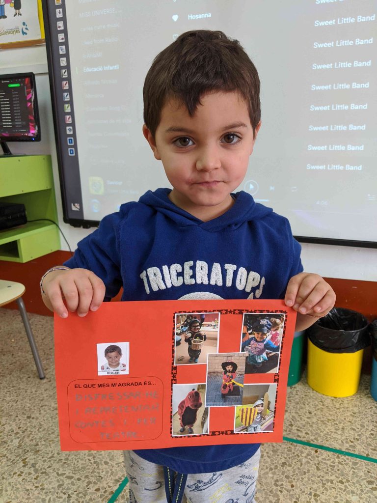 En Roger parla molt bé davant els companys i encara que no és de massa paraules li agrada explicar-nos coses. En aquesta ocasió ens ha explicat que el que li agrada més és disfressar-se. A casa té una capsa on guarda les disfresses, la seva preferida és la de drac, però també li agrada la de Sant Jordi, o la de castanyera. Ell juga a disfressar-se amb els germans i els cosins però a vegades també juga sol a disfressar-se. Ens ha explicat també que li agrada fer teatre. Ho ha fet molt bé perquè ens ho ha explicat tot ell sol i també ha sabut respondre les preguntes dels companys i companyes i les del mestre. Endavant les disfresses, segur que per Carnestoltes t’ho passaràs d’allò més bé.