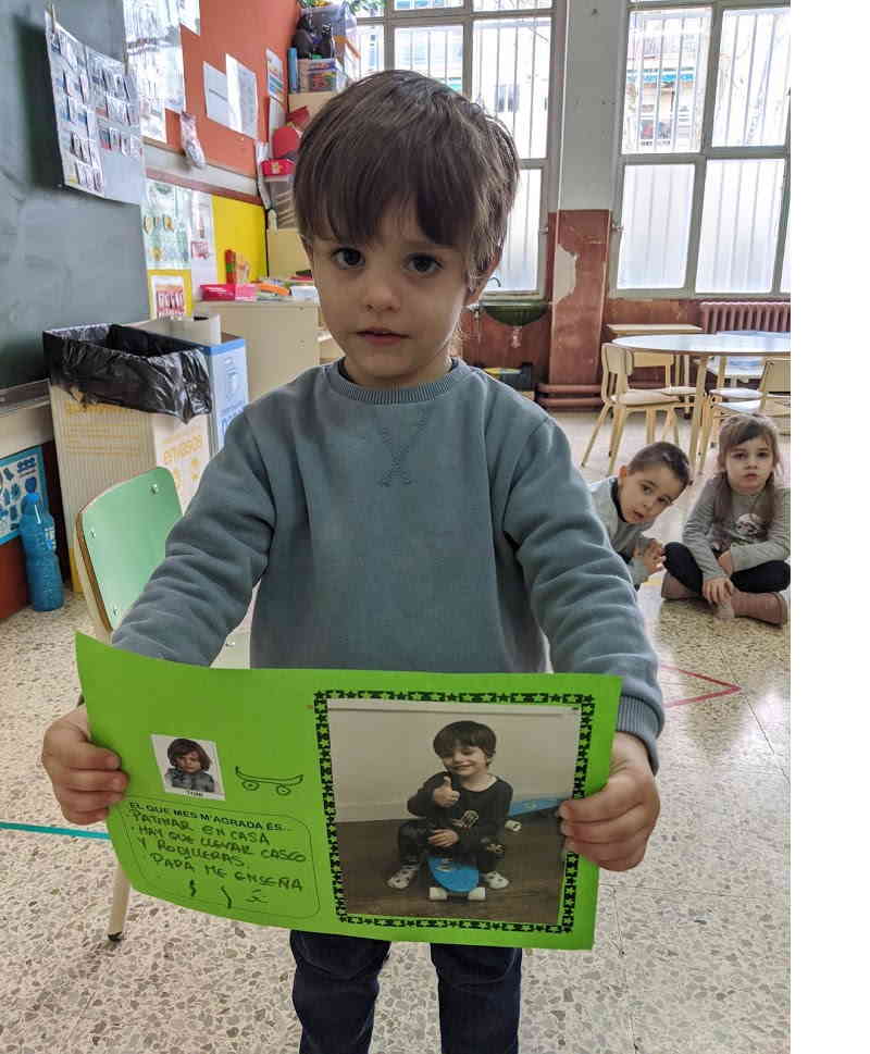 Ens ha explicat un munt de coses sobre el seu patinet i ens ha agradat molt veure la foto que ha posat al full. Anar en patinet és molt divertit i altres nens i nenes de la classe també en tenen i vam poder parlar sobre la seguretat que necessitem per anar en patinet com haver de portar genolleres i casc.