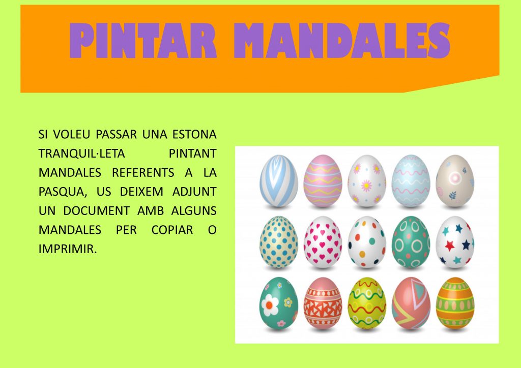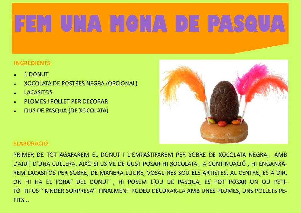 En aquest primer dia de vacances us proposem un seguit d’activitats, moltes relacionades amb la mona o la Pasqua per fer durant els dies de Setmana Santa. Podeu seguir enviant fotos al correu carles.alcoberro@salesianas.org així podem anar penjant-les al bloc.