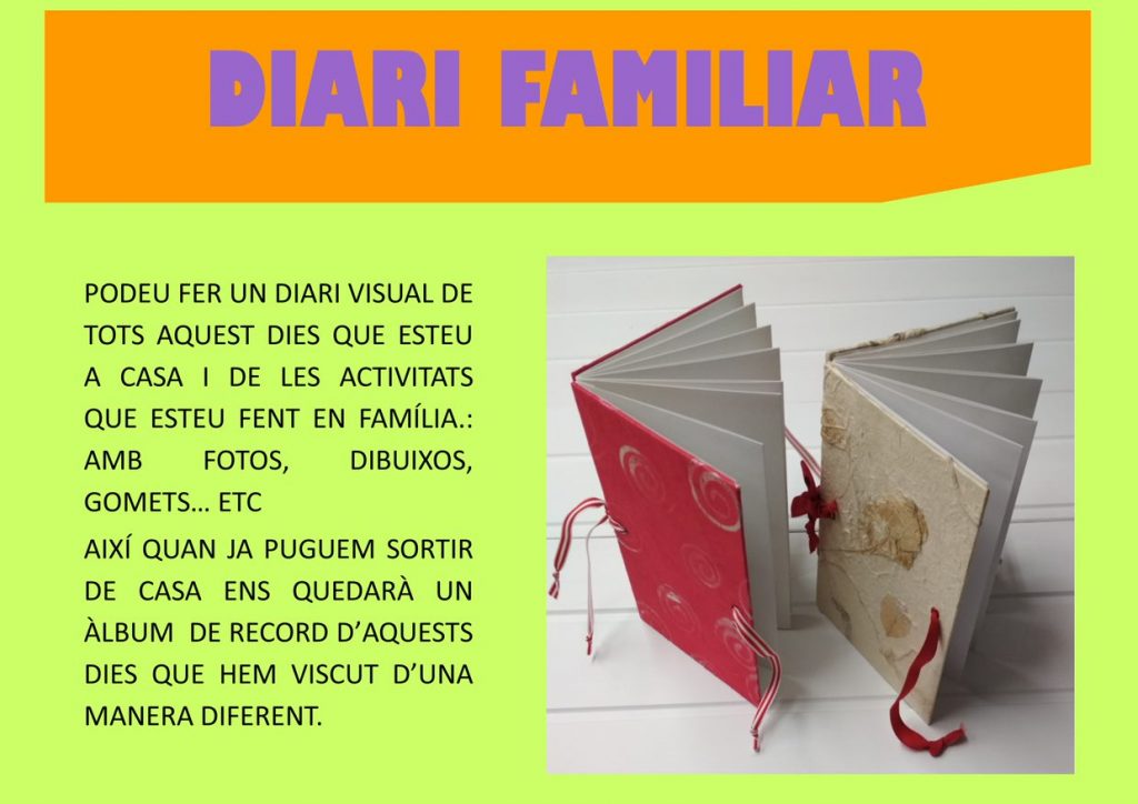 Esperem que aquestes propostes us siguin útils per passar bones estones amb els nens i nenes. El dimarts, 14 d’abril penjarem noves activitats i novetats en relació a les activitats d’ensenyament aprenentatge.