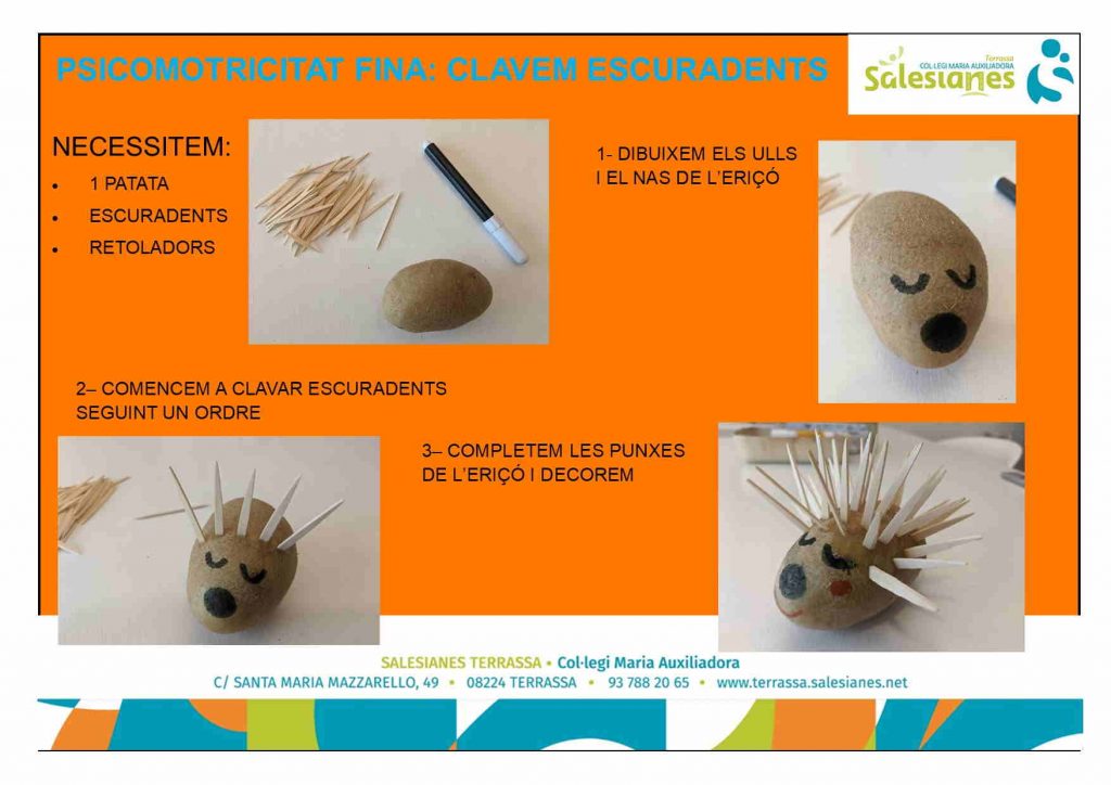 La importància del treball és que el nen o la nena clavi bé els escuradents a la patata. Al principi els pot costar una mica, sobretot si hem de seguir un ordre o files d’escuradents per tal que el resultat sigui més estètic.