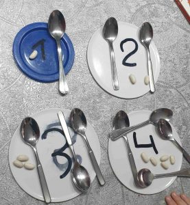 En el següent vídeo us proposem jugar amb material. Primer podeu posar els plats ordenats però els podeu desordenar després per veure si la nena o el nen associa bé grafia y cuantitat. Podeu fer servir culleres, després olives, lacasitos… el que tingueu per casa.