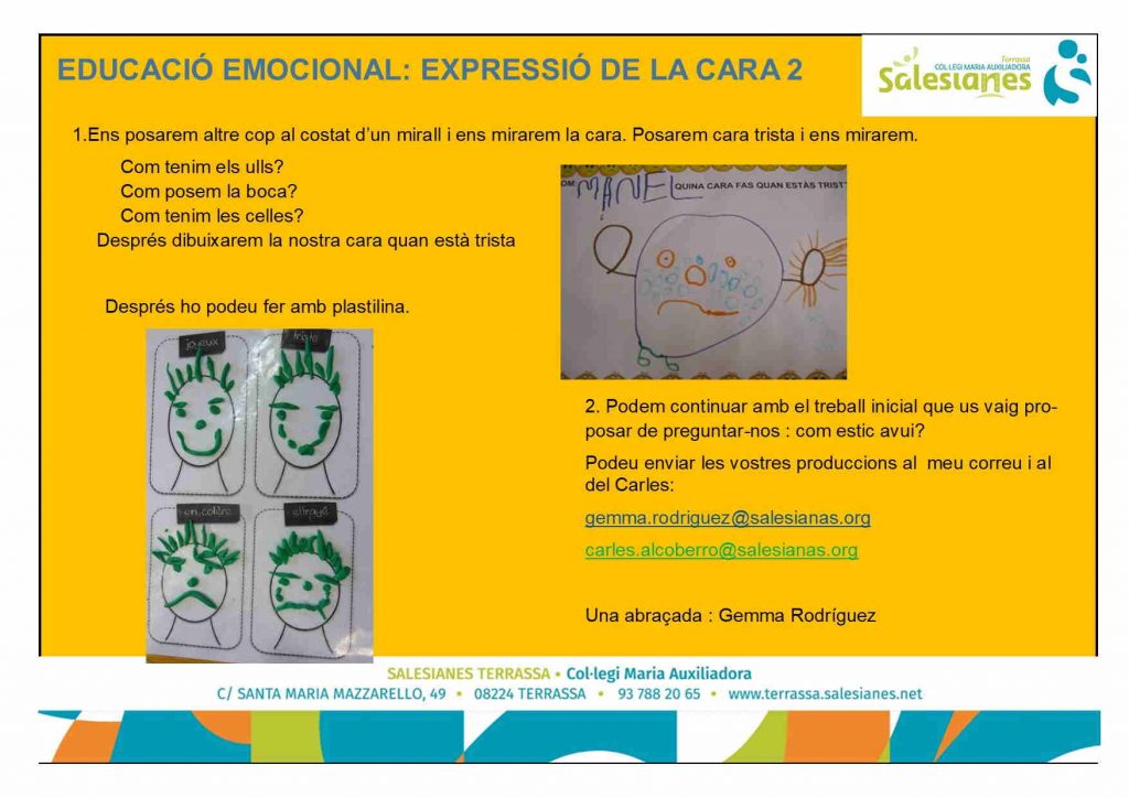 Veureu que cal fer un dibuix de la cara trista i després fer la mateixa activitat amb plastilina. És important parlar del sentiment de tristesa, podeu preguntar als vostres fills/es en quins moments del confinament es senten tristos, a qui troben a faltar, quines situacions extranyen (anar a l’escola, anar al parc, visitar familiars…) Es tracta que els nens i nenes puguin canalitzar la pena i saber-la expressar.