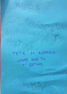 Per tal de facilitar-vos i assessorar-vos de com fer-ho he creat un vídeo on explico com fem les cartes a P3, es tracta de fer una carta en escriptura lliure. Es tracta que el nen/a vulgui fer una carta a un company, al pare, a la mare, al Carles… amb un missatge, evidentment un nen/a de P3 no sap escriure autònomament però sí que pot tenir clar què li vol dir. Alguns nens i nenes només faran lletres sueltes altres les vocals… En el vídeo queda molt clar.