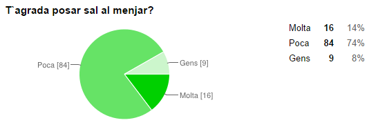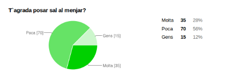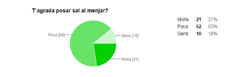 Tal com hem estudiat en el nostre treball, la sal presenta uns aspectes negatius quan el seu consum és excessiu i vàrem voler saber quin percentatge de població consumeix aquest de manera excessiva i quin percentatge de població fa un consum raonable i no perjudicial per a la seva salut.