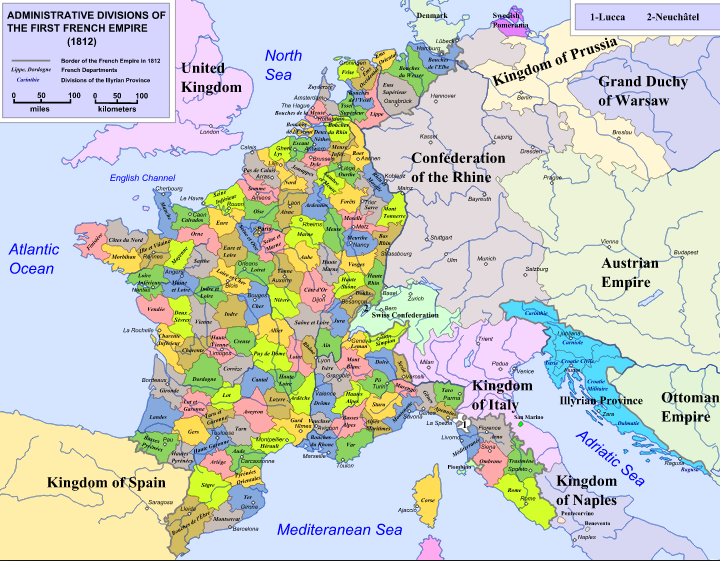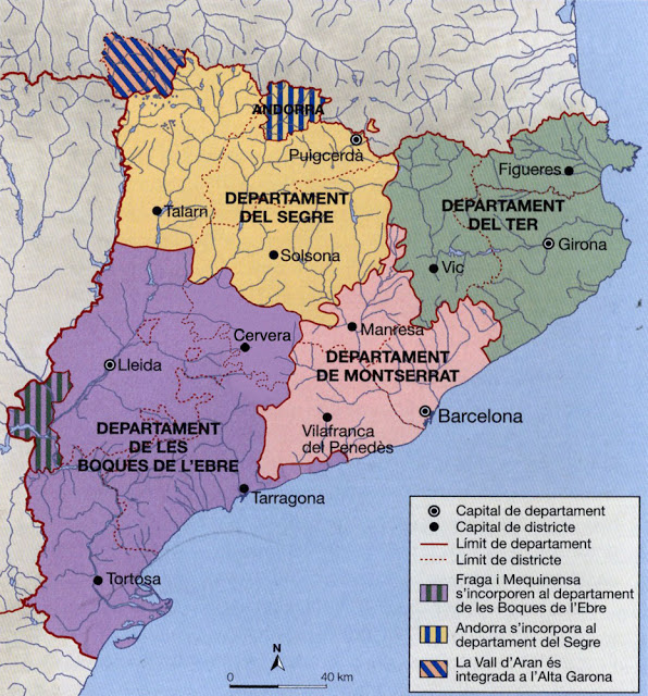 I amb la peculiaritat que Catalunya és annexionada a l’Imperi francès napoleònic el 1812 fins el 1814. Durant dos anys Catalunya és un territori més de l’Imperi napoleònic i, com a tal, dividida en quatre departaments amb noms geogràfics -com passa en la majoria dels departaments del país veí. Per tant hi haurà un departament del Segre (sense la Vall d’Aran), del Ter, del Montserrat i de les Boques de l’Ebre. És fàcil identificar-ho amb la divisió provincial actual: on diu del Segre diem de LLeida; del Ter, Girona; de Montserrat, Barcelona; i de Boques de l’Ebre, evidentment, Tarragona. I durant aquests dos anys, per exemple, el Diari de Barcelona (ara desparegut però publicat des del 1772 fins el 1994), va sortir publicat tant en francès com en català. La primera vegada des del segle XVIII en què el català tornava a ser llengua de premsa. Per tant, vam ser francesos durant dos anys!!!