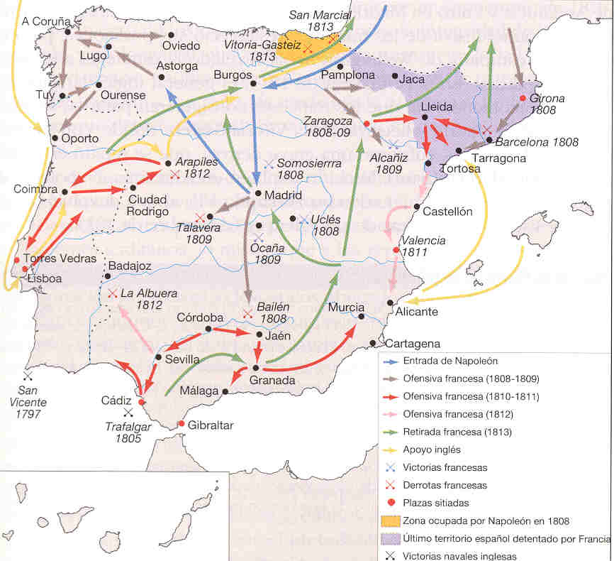I. Guerra de la Independència (1808-1814), més ben dit, guerra civil (absolutistes contra liberals, liberals afrancessats contra “doceañistas”, espanyols contra francesos i campant per tota la geografia hisànica, francesos i anglesos fent la seva pròpia guerra. Paral.lelament es desenvolupa la primera temptativa de revolució liberal espanyola que té com a moment culminant la Constitució de Cadis del 1812.