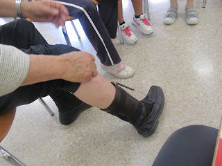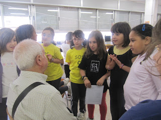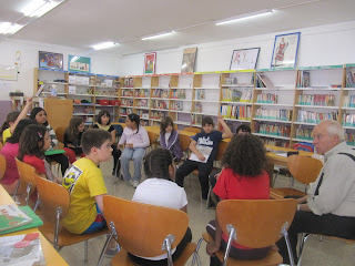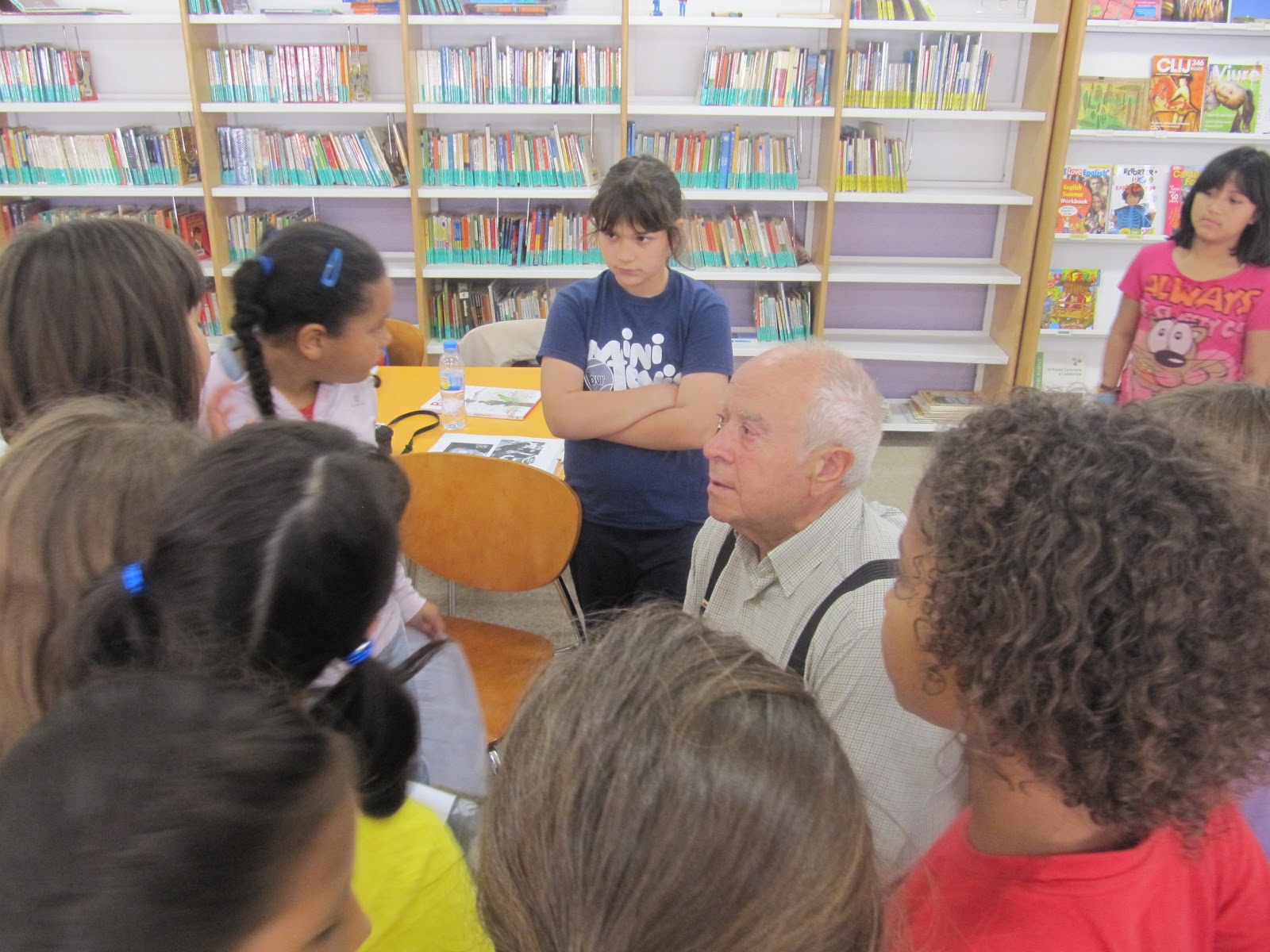 Aquesta era l’última sessió d’aquest curs i teníem un convidat molt especial i estimat per tots, l’avi Salvador Roca, que coneixem perquè a l’escola ens ajuda i ens ensenya  a mantenir i cuidar de l’hort. Però en aquesta ocasió venia a respondre les preguntes que els nens i nenes li feien sobre la guerra civil, doncs els dos llibres que havíem llegit( Tres Tambors i Fill de rojo. Tantagora) explicaven cadascú una història familiar viscuda en aquest període de guerra.