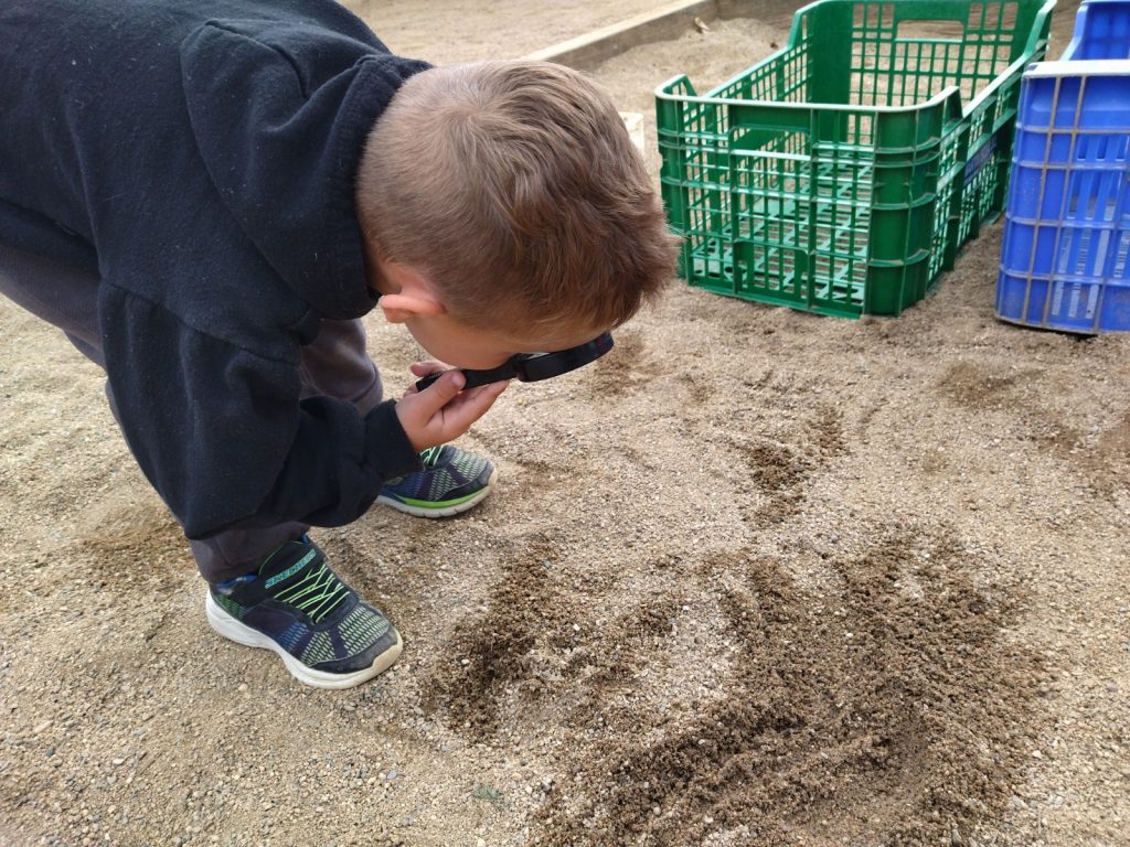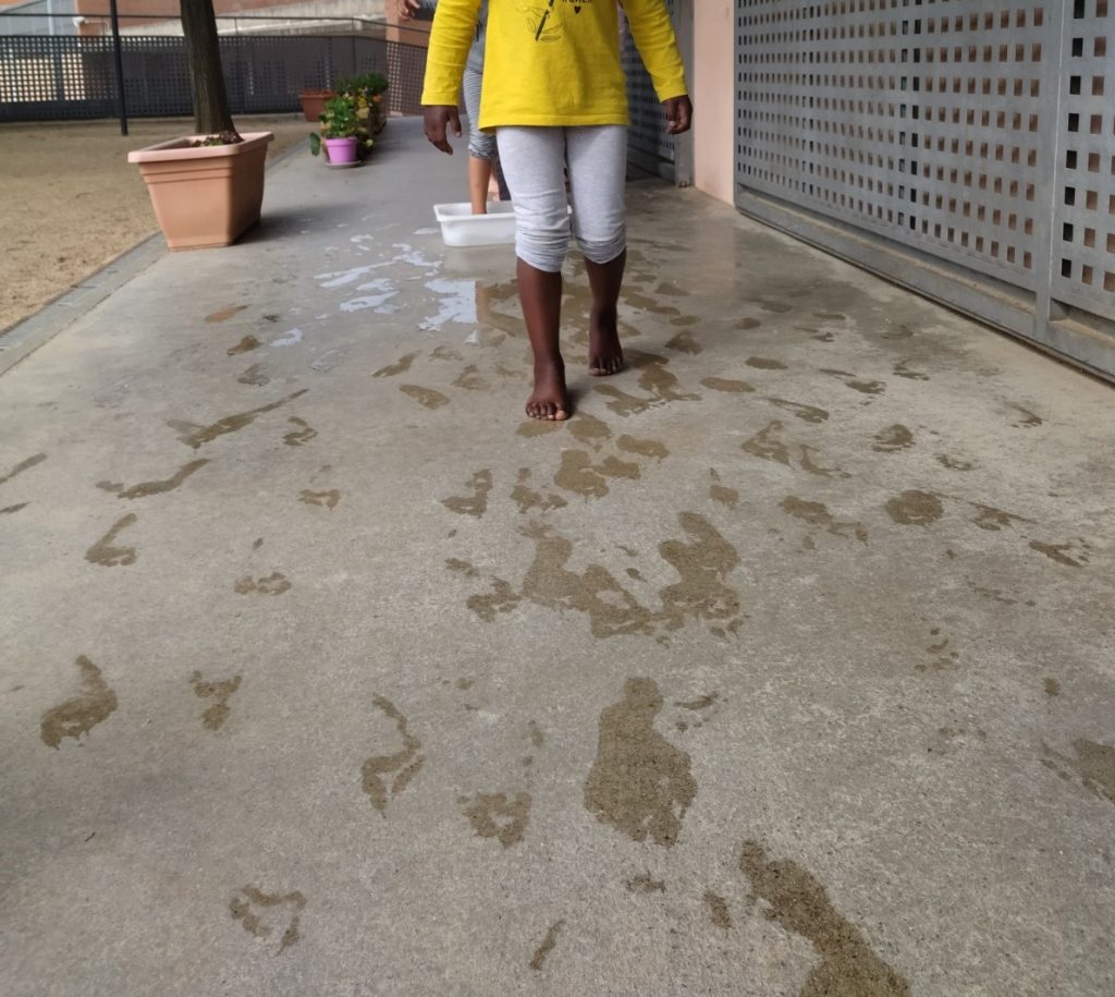 Un dels aspectes que més els ha impactat, ha estat les petjades de l’os i la lloba i decidim buscar les nostres petjades al pati amb l’ajuda de la lupa, i fem petjades a l’asfalt trepitjant amb els peus mullats. Durant l’activitat, la mestra fa fotografies, que en una altra sessió projectarà i servirà per fer una petita conversa amb els infants.