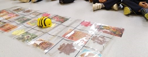 En les sessions de racons matemàtics, s’incorpora una activitat en relació amb el projecte dels animals del bosc, en què l’alumnat haurà de programar la BeeBot perquè vagi des de la imatge d’un dels dos animals, fins a l’altre extrem, on trobaran la seva petjada.