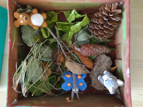 Per finalitzar el projecte, els infants creen el seu propi mini-món. Per fer-ho, porten una capsa de sabates de casa, la pinten de verd per dins i per fora, i la decoren amb els elements del bosc que han anat portant durant les diferents setmanes, i dels animals que han fet amb plastilina. Sobre de la capsa, s’enganxarà un full on hi haurà el títol del projecte, el nom de l’alumne, i un codi QR creat amb https://es.qr-code-generator.com/ per tal que a l’arribar a casa, les famílies puguin escanejar-lo, i escoltar l’àudio que els seu fill/a ha gravat explicant de què es tracta aquest projecte.