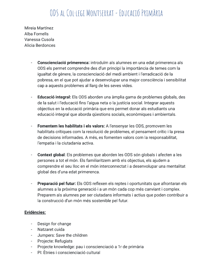 • Preparació pel futur: Els ODS reflexen els reptes i oportunitats que afrontaran els alumnes a la pròxima generació i a un món cada cop més canviant i complex. Preparem als alumnes per ser ciutadans informats i actius que poden contribuir a la construcció d’un món més sostenible pel futur.Evidències: