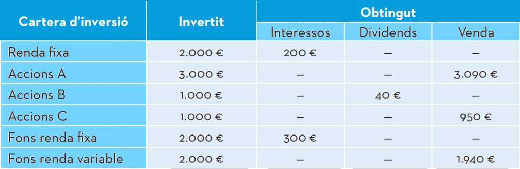 Fa dotze mesos, el Camilo va constituir una cartera d’inversió que combinava renda fixa, renda variable i fons d’inversió d’acord amb el que pots veure a la taula següent: