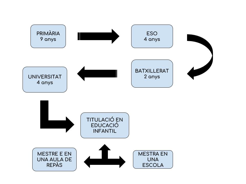 Desprès de 9 anys d’educació primària obligatòria i 4 anys d’educació Secundaria Obligatòria hauria d’escollir entre fer un batxillerat de 2 anys, que pot ser qualsevol, però el més aconsellable és el batxillerat social-humanístic o una formació professional que serien 2 anys de Grau Mitja i si volgués fer un Grau Superior serien 2 anys més. El Grau Mitja pot ser de gestió o d’altres que et donguin l’entrada a un grau superior de tècnic d’educació infantil.