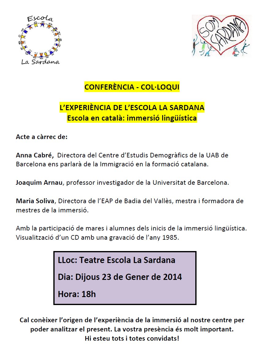 El passat dijous 23 de Gener va tenir lloc a la nostra escola una conferència-col·loqui preparada amb molta il·lusió amb la intenció de recordar els inicis de la immersió lingüística a la Sardana, un dels centres pilot a Catalunya en els anys 80.