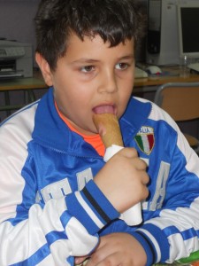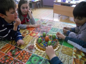 Posem la melmelada de préssec a sobre d’una planxa de pa de pessic i a sobre col.loquem altra planxa de pa de pessic, tornant a untar melmelada de préssec en aquesta. Tapem el pastís amb l’ultima planxa de pa de pessic i decorem amb la nocilla, els m&m’s i els ous de xocolata. Molt senzilla, però boníssima!!!