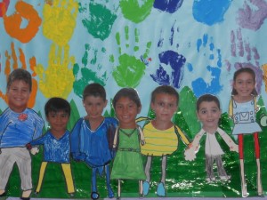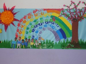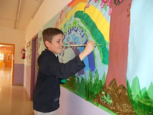 Per donar la benvinguda a la primavera, entre tots hem fet un mural. Ara que ha acabat l’hivern, al nostre arbre li han crescut tot de flors i fulles verdes. Un gran sol ha fet desaparèixer la neu donant pas a un gran arc de Sant Martí que hem pintat estampant les nostres mans. Els animalets han tornat a sortir i les papallones ens enlluernen amb els seus colors.