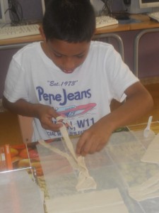 Agafem la massa de pasta de full i l’estirem. Aquesta massa l’hem de taller en rectangles llargs. Una vegada tenim els rectangles, aquests han de quedar dividits en 3 tires, ho tallem amb unes tisores o amb el ganivet, però mai arribant fins al final, per no separarles del tot. Ara ja podem començar a fer la trena amb la pasta de full. Una vegada la tenim acabada, la posem a la safata, li tirem sucre per sobre i al forn 10 minutets aprox. fins que es dori una mica.