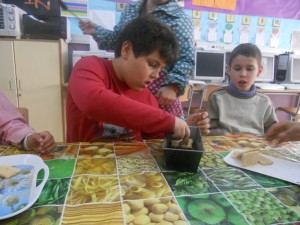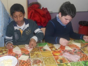 Cada nen agafa 2 talls de pa de motllo. A sobre d’un afegim pernil dolç fins a cobrir-ho i a sobre de l’altre untem sobrassada. Una vegada tenim això afegim a sobre de cada llesca un tall de formatge i un altre de pa de motllo. Ara ja està fet el biquini, només ens queda untar la mantega per les dues bandes per a que no s’enganxi i els posem a la sadwitchera.