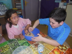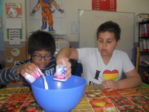 Posem a un bol els iogurts, el formatge i la meitat del sucre, això s’ha de batre fins que sigui cremós.