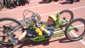 S’ho va passar d’allò més bé amb els companys i va conduir una bicicleta molt especial, per a que la bicicleta corregués havia de moure els braços enlloc de les cames.