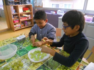 Pelem el raïm, el tallem per la meitat i treiem els pinyols.