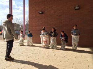 A la tarda, hem anat al pati de l’escola, on un grup d’ alumnes de l’Institut ens han organitzat uns jocs: mataconills, cursa de sacs, la bandera i un joc d’atrapada/persecució.