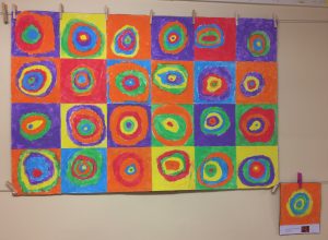 Hem començat per fer un treball de tot el grup classe a partir del quadre Squares with concentric circles (1913). Cadascú ha dibuixat i pintat un requadre, després els hem ajuntat un al costat de l’altre i hem aconseguit aquest efecte: