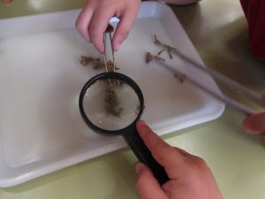 - Finalment vam enganxar el material trobat en unes cartolines per poder-ho estudiar i consultar amb algun expert, de quin animal es tracta. Amb guants, pinces i lupes ens ho vam passar molt bé fent de científics.