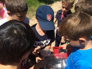 Fem d’exploradors: Hem caçat diversos tipus d’animals que hem guardat en recipients i càpsules de petri per observar amb les lupes. Després els hem deixat lliures.