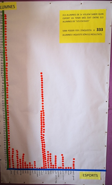 El dimecres, la reina carnestoltes ens va donar la consigna de venir a l’escola, disfressats d’un esport, del nostre esport preferit.I…nosaltres vam voler saber quins esports havien tingut més èxit. Així doncs, ens vam posar mans a l’obra! Vam haver de pensar moltes coses! Com fer l’enquesta als alumnes d’una manera segura i àgil, recollir bé les dades i fer una representació visual perquè tots els alumnes des dels més petit fins al més gran ho pogués entendre. Aquí teniu una petita representació.