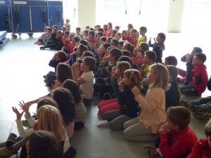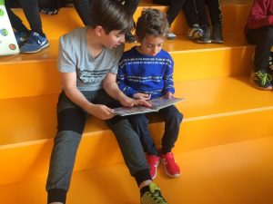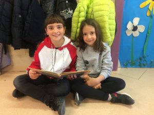 Ens ajuntem per parelles o trios i ens distribuïm per la classe, el passadís o també a la biblioteca de l’escola. I comencem a llegir o a escoltar la lectura de contes. De seguida ha passat la mitja hora i ja ens diem adéu fins la propera trobada.