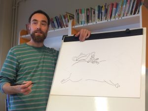 I avui s’ha presentat a la Biblioteca i ens ha explicat quina és la seva feina: Diu que quan li donen el conte escrit, comença a fer molts dibuixos sobre cada personatge fins que troba el que li agrada. També ens ha dit que dibuixa amb l’ordinador i que després fa proves amb color.
