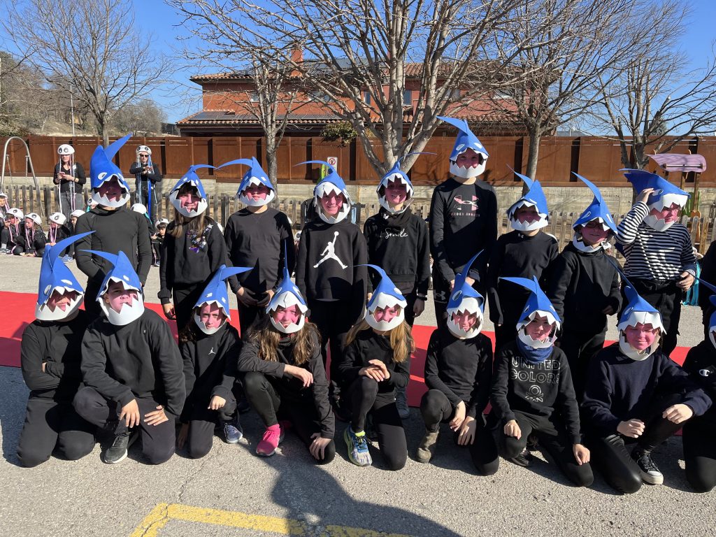 Dilluns vam venir amb pijama, dimarts ben arreglats, dimecres de banyistes, dijous amb el cap ben guarnit de color blau i avui divendres de taurons, juntament amb els d’I4 que són els nostres germans petits, que s’han disfressat de dofins i conjuntament hem elaborat la disfressa i hem fet la desfilada.