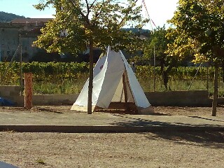 En primer lloc, vam treure l’escorça dels troncs que havien portat dies enrere. Tot seguit, vam fer forats al terra per posar els troncs del tepee. Després vam col·locar els troncs formant una mena de cons,vam assegurar els troncs amb ciment i finalment vam posar la tela per sobre.