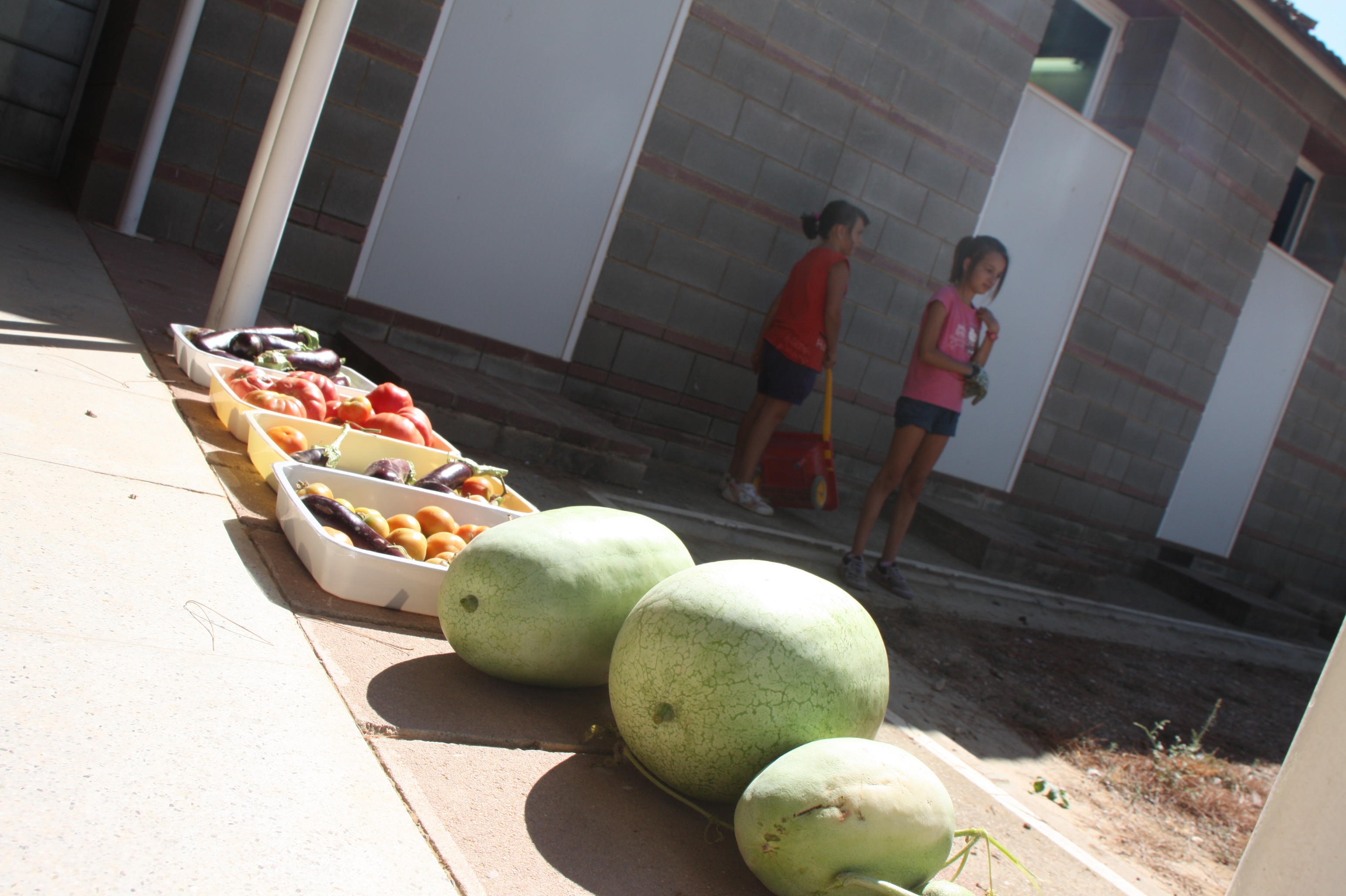 A principis de setembre tots els alumnes i alguns mestres de l’escola vam sortir a l’hort per collir les hortalisses que havíem plantat abans de marxar de vacances. Les síndries estaven gegants, les albergínies enormes i els tomaquets de penjar i els de sucar estaven molt brillants i això que no havíem posat cap producte químic. Com que les síndries feien molt bona pinta, els mestres les van posar a refrescar a la nevera i a la tarda ens les vam menjar. No podien ser millor, eren boníssimes!