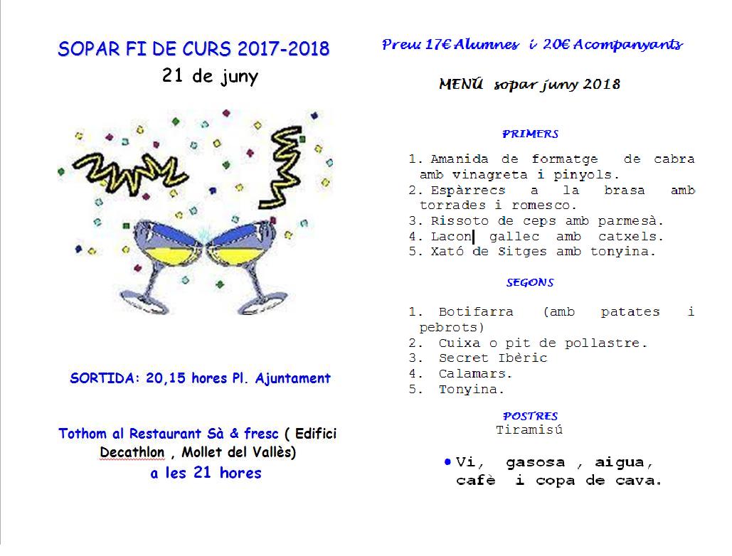 Ho farem a Mollet i anirem amb autocar des de la Llagosta. Aquí trobareu també el menú d’on s’ha de triar un primer i un segon. Apunteu-vos que se’ns acabaran les places! Les llistes ja són a la sala de professors.