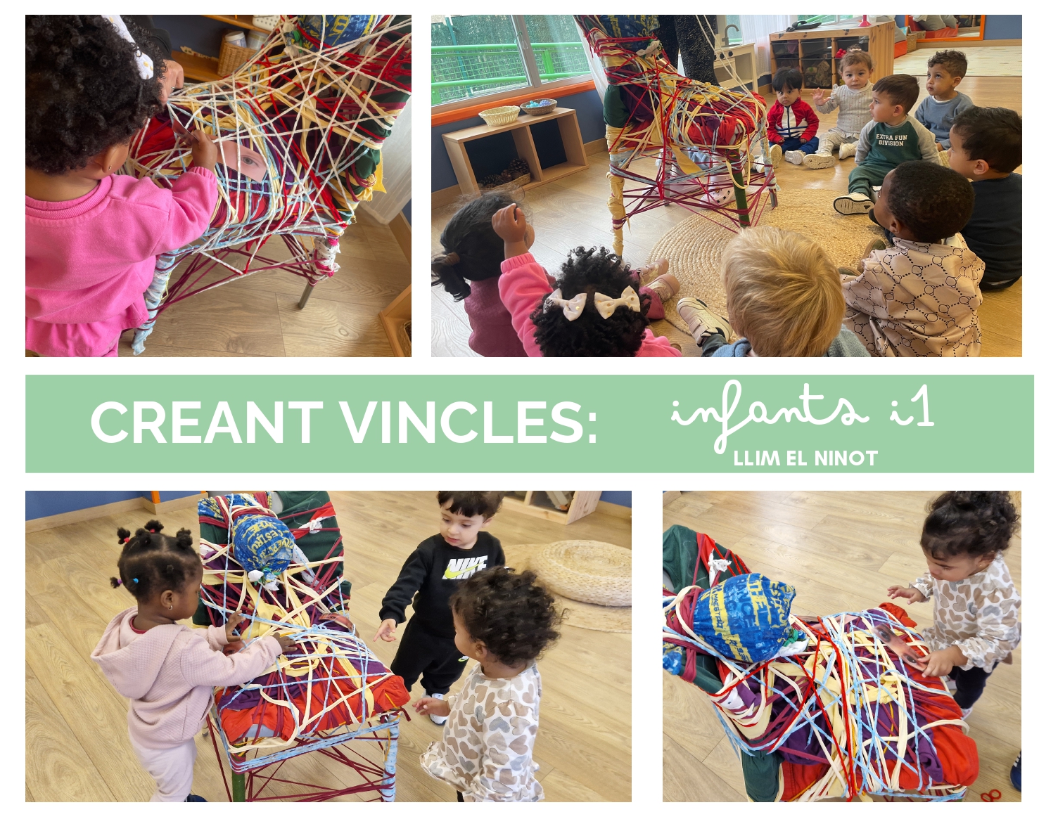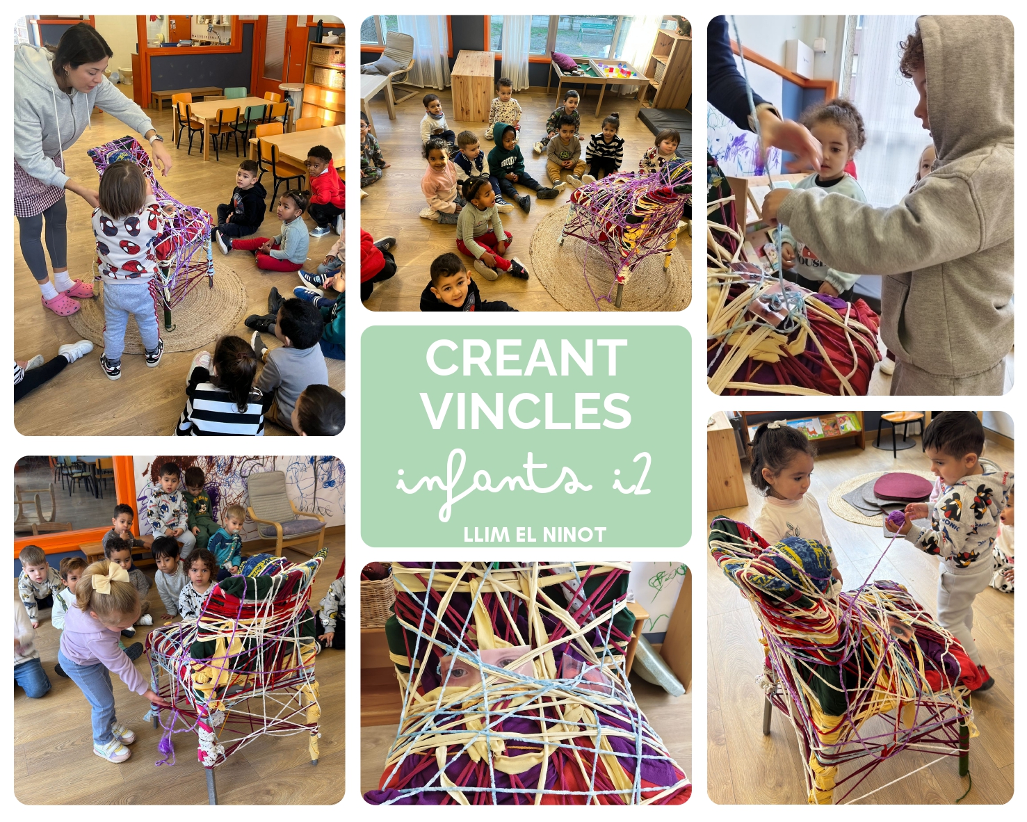 Benvolgudes famílies! Amb motiu del Dia Internacional de la Infància, els vostres fills i filles han participat en la continuïtat d’una experiència artística molt especial a la nostra llar, en col·laboració amb l’Institut Vidal i Barraquer. L’alumnat de l’Institut ha preparat unes cadires decorades amb teixits. Ara, els infants de la llar prendran el relleu creatiu, escolliran petits objectes (joguines, xumets o elements quotidians) i els embolcallaran amb teles i fils. Amb les seves mans, uniran aquests objectes a les cadires de l’Institut, creant una obra conjunta que simbolitza el diàleg entre les diferents etapes de la infància.