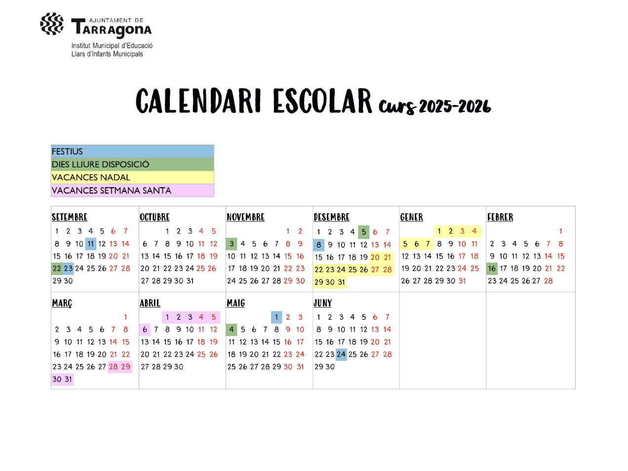 Horari i calendari Horaris d’entrada i sortida: ENTRADES SORTIDES Matí: De 9h. a 9:30h. De 12h. a 12:30h. Tarda: De 15h. a 15:15h. De 16:30h. a 17h. Calendari curs 2025-26: