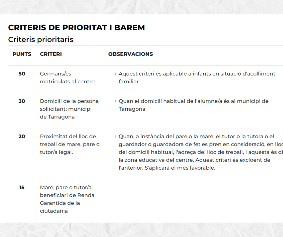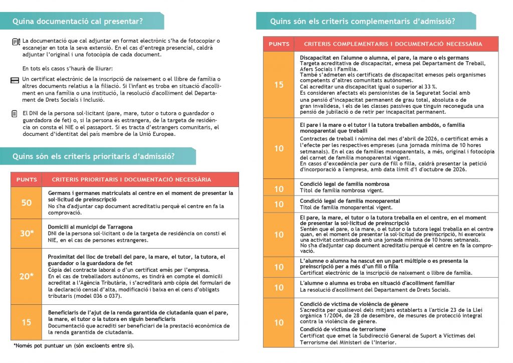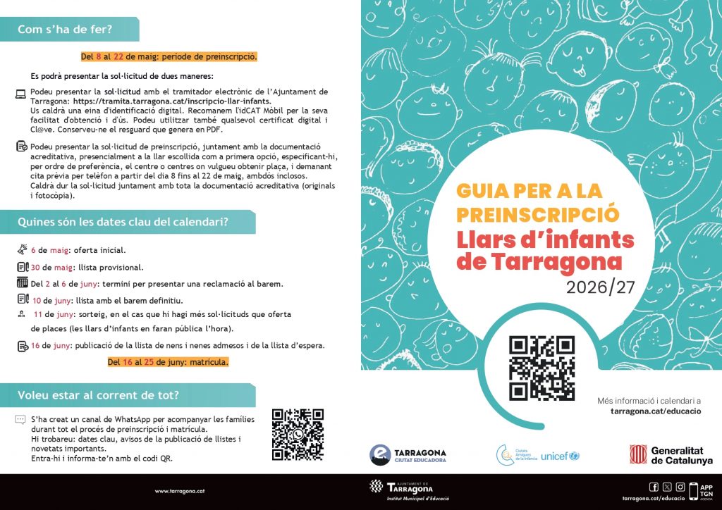 - 8 al 22 de maig: període de preinscripció. Es pot fer de forma telemàtica i presencial. Aquesta última sempre amb cita prèvia (977545274).