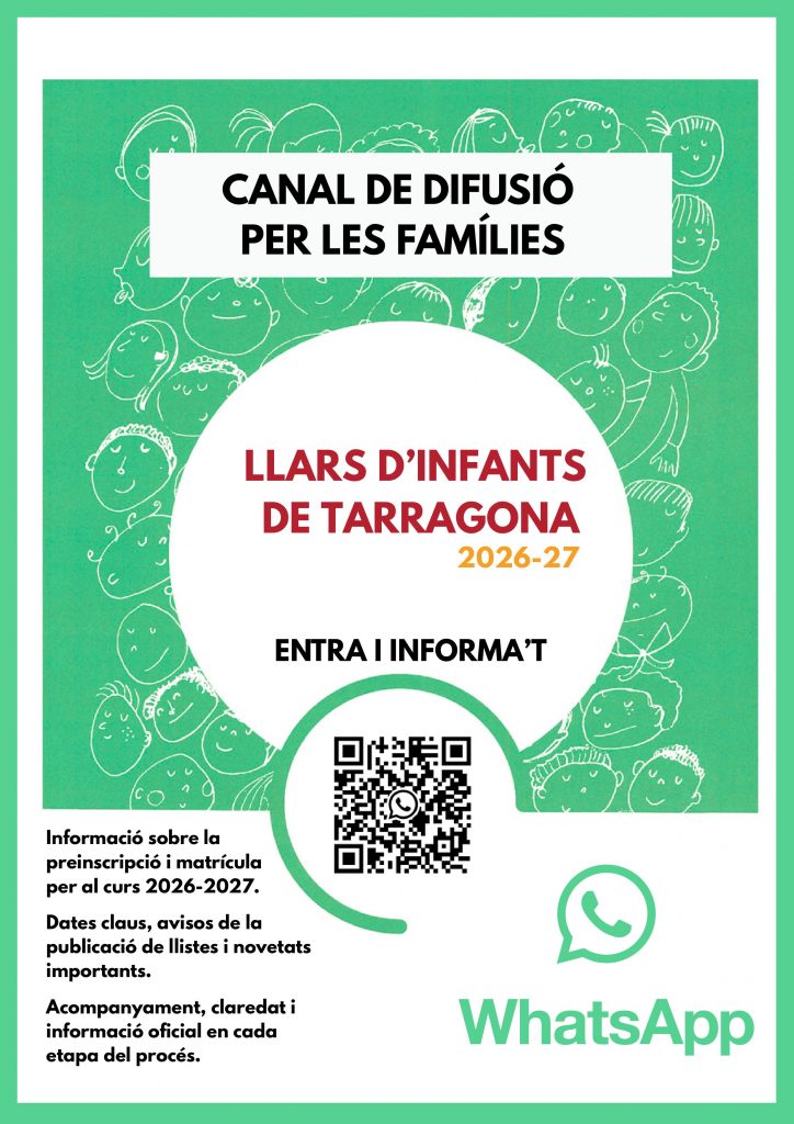 Famílies, si voleu tenir informació sobre el procés de preinscripció a les llars d’infants municipals de Tarragona, només heu d’entrar al canal de difusió mitjançant aquest codi QR.