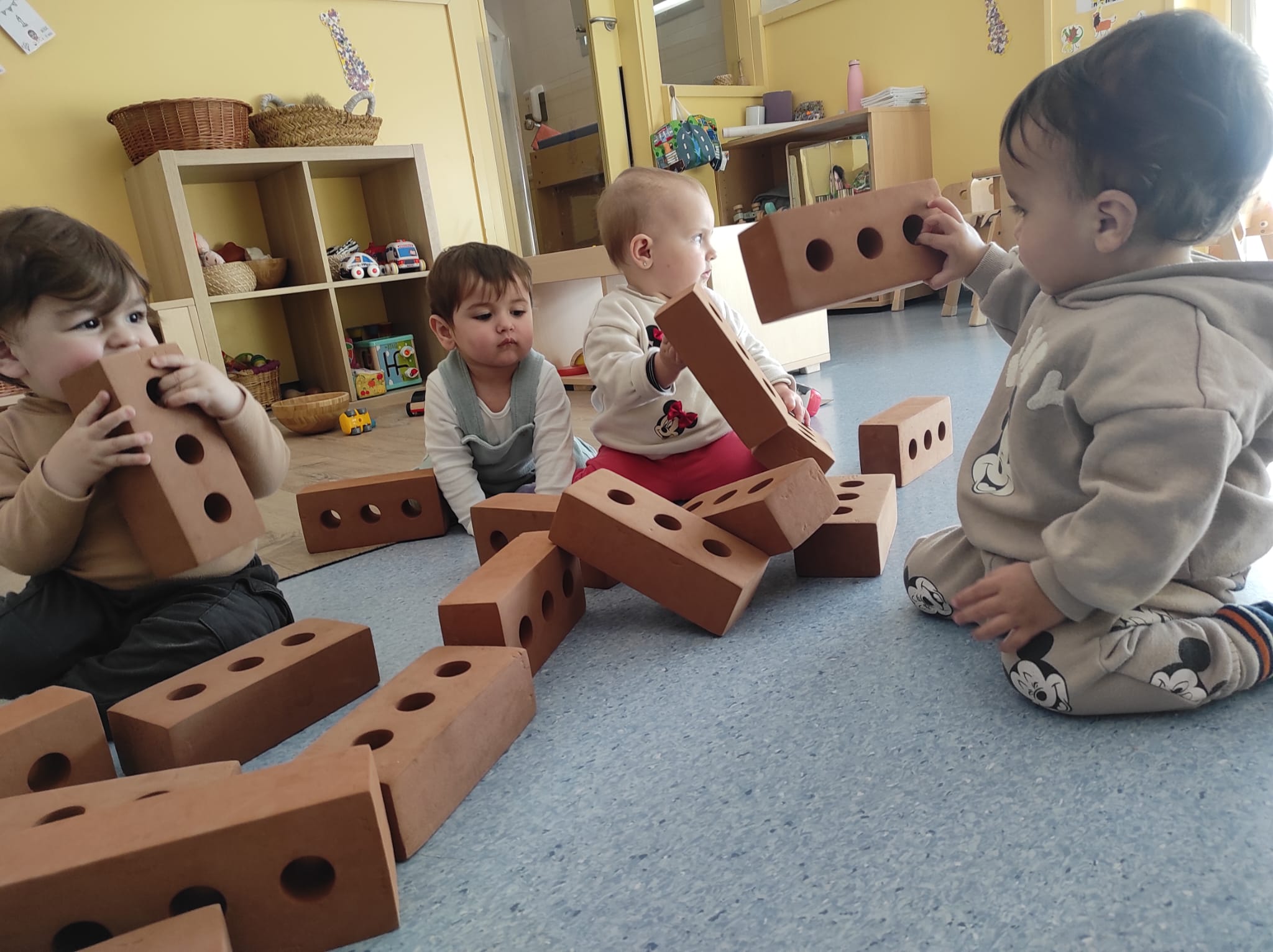 Els infants de l’estança del Lleó comencen a desplaçar-se per tot l’espai de l’estança i gaudeixen manipulant, apilant i destrossant torres altes construïdes amb maons.