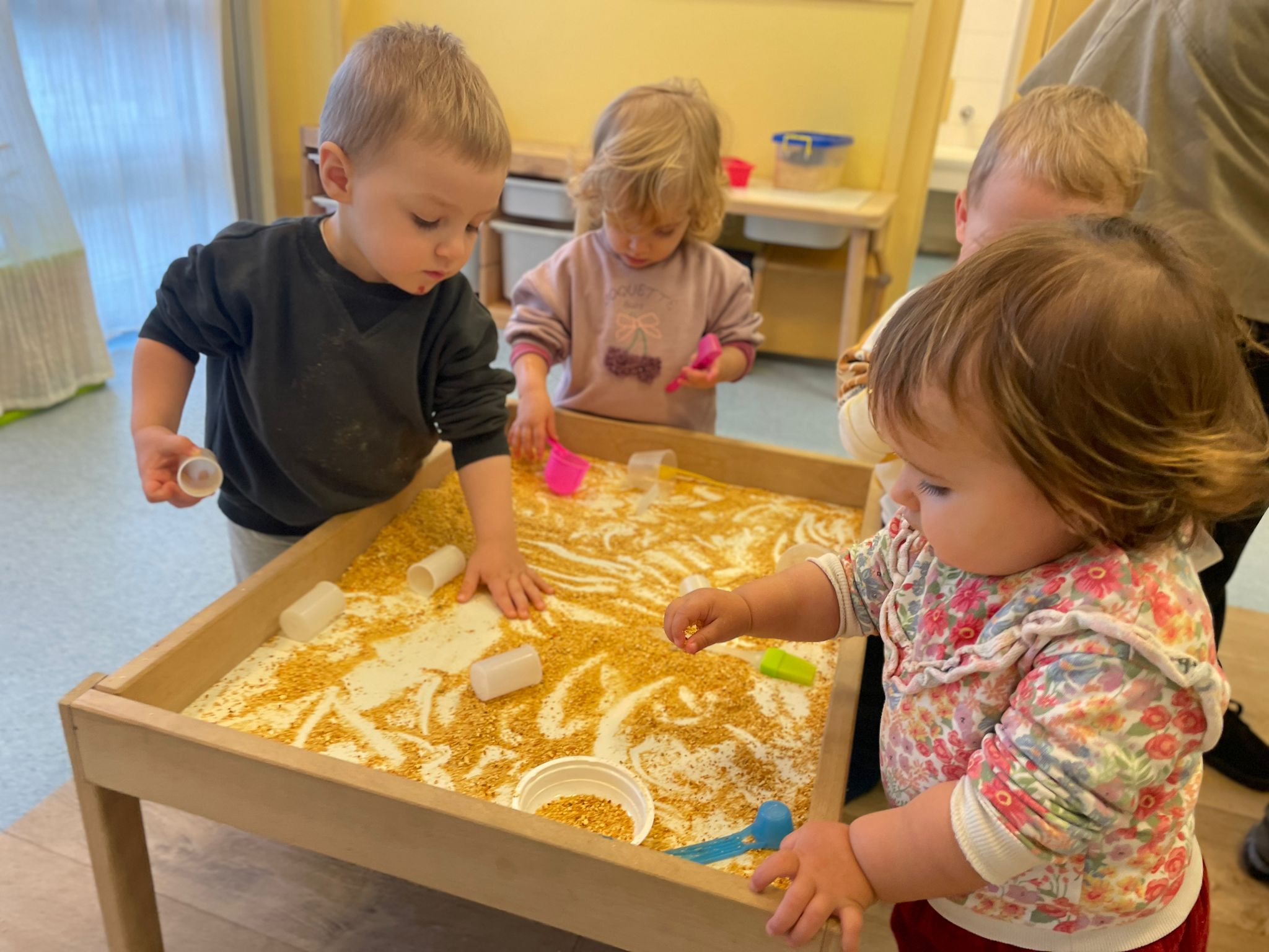 Els infants de les estances d’1 a 2 anys passen llargues estones concentrats experimentant amb la pell de mandarina mòlta.