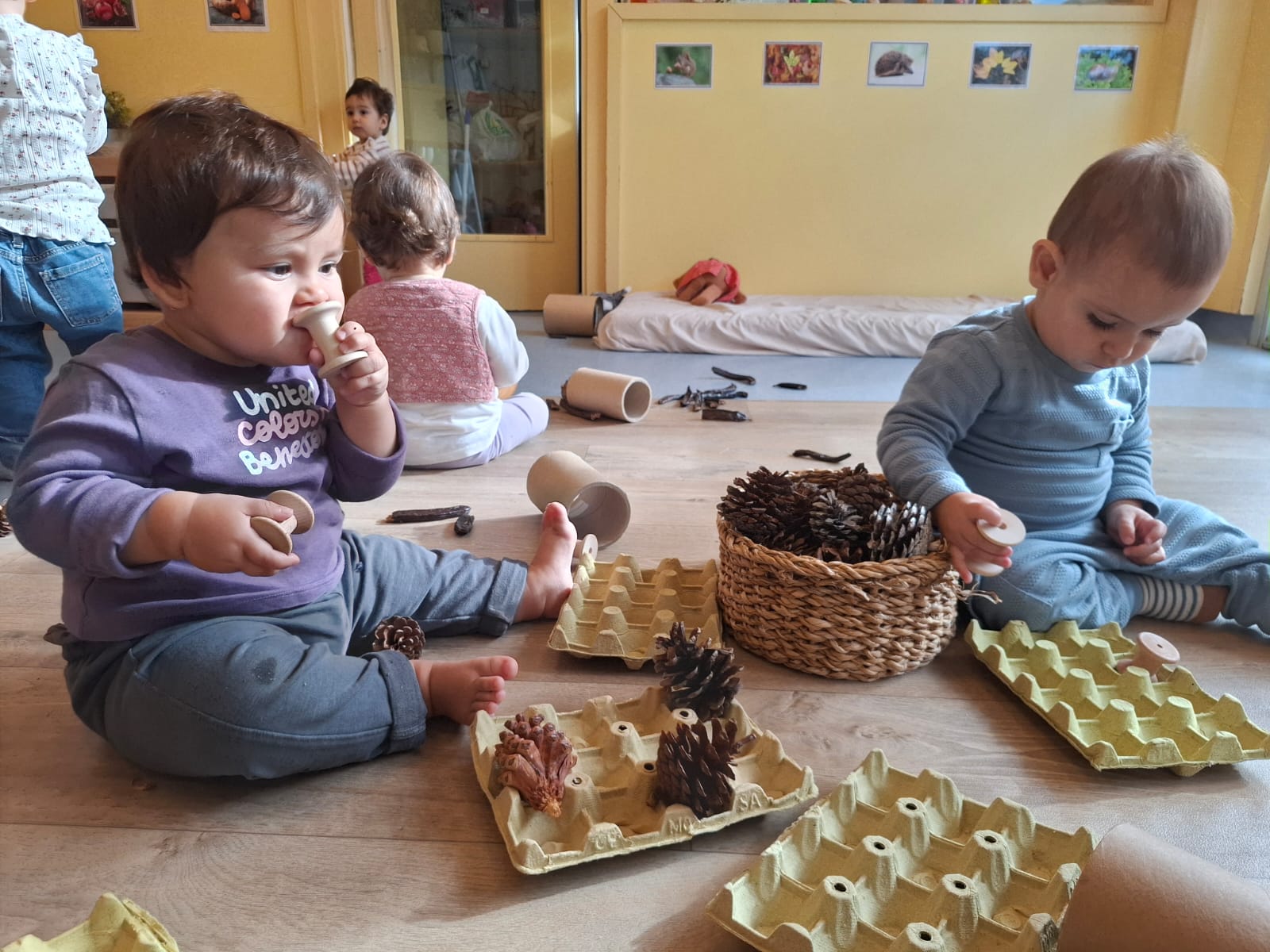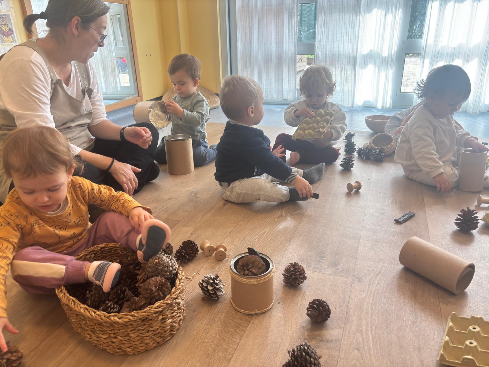 A les estances de l’Àliga i Mulassa hem fet una proposta amb materials naturals (pinyes, garrofes…) i contenidors (oueres, pots metàl.lics, tubs de cartró, cistelles de vímet, bols de fusta…). Han passat una estona d’allò més entretinguda ben concentrats tot experimentant, indagant i descobrint.