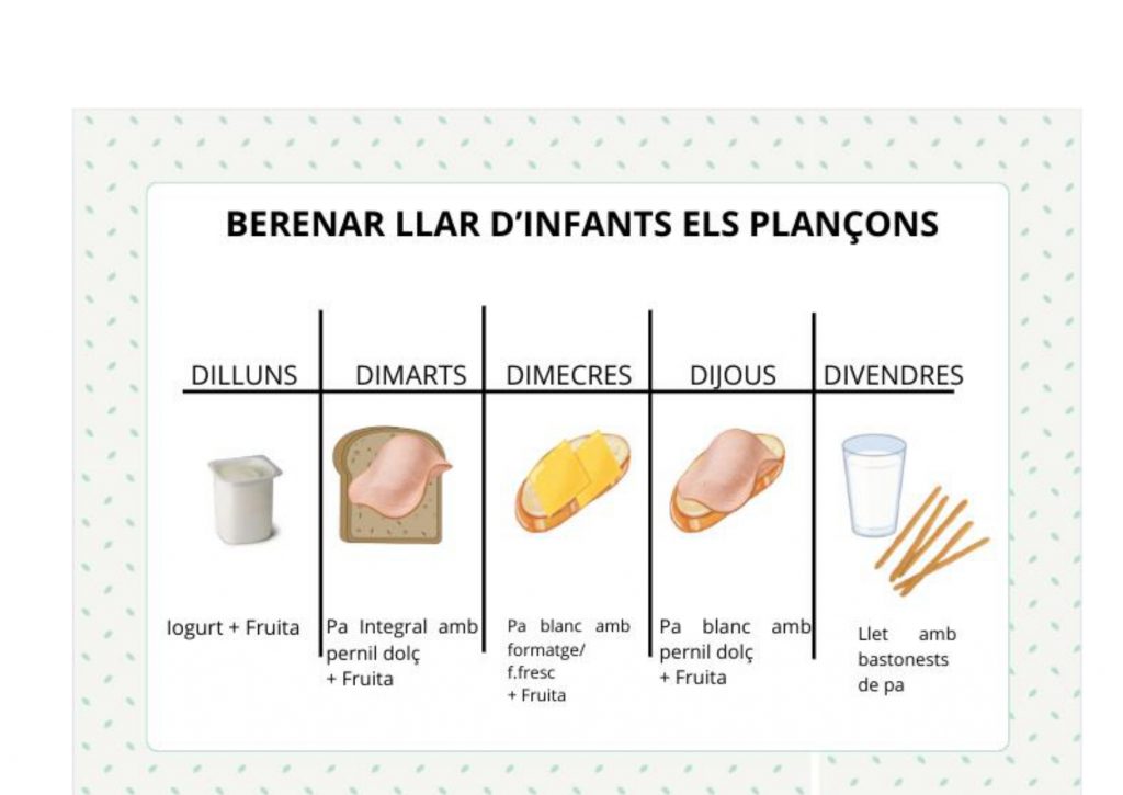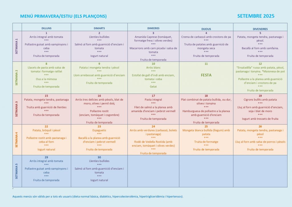Us adjuntem el menú del mes. Tots els àpats són adaptats a les necessitats evolutives, fisiològiques, intoleràncies i al·lèrgies dels infants.